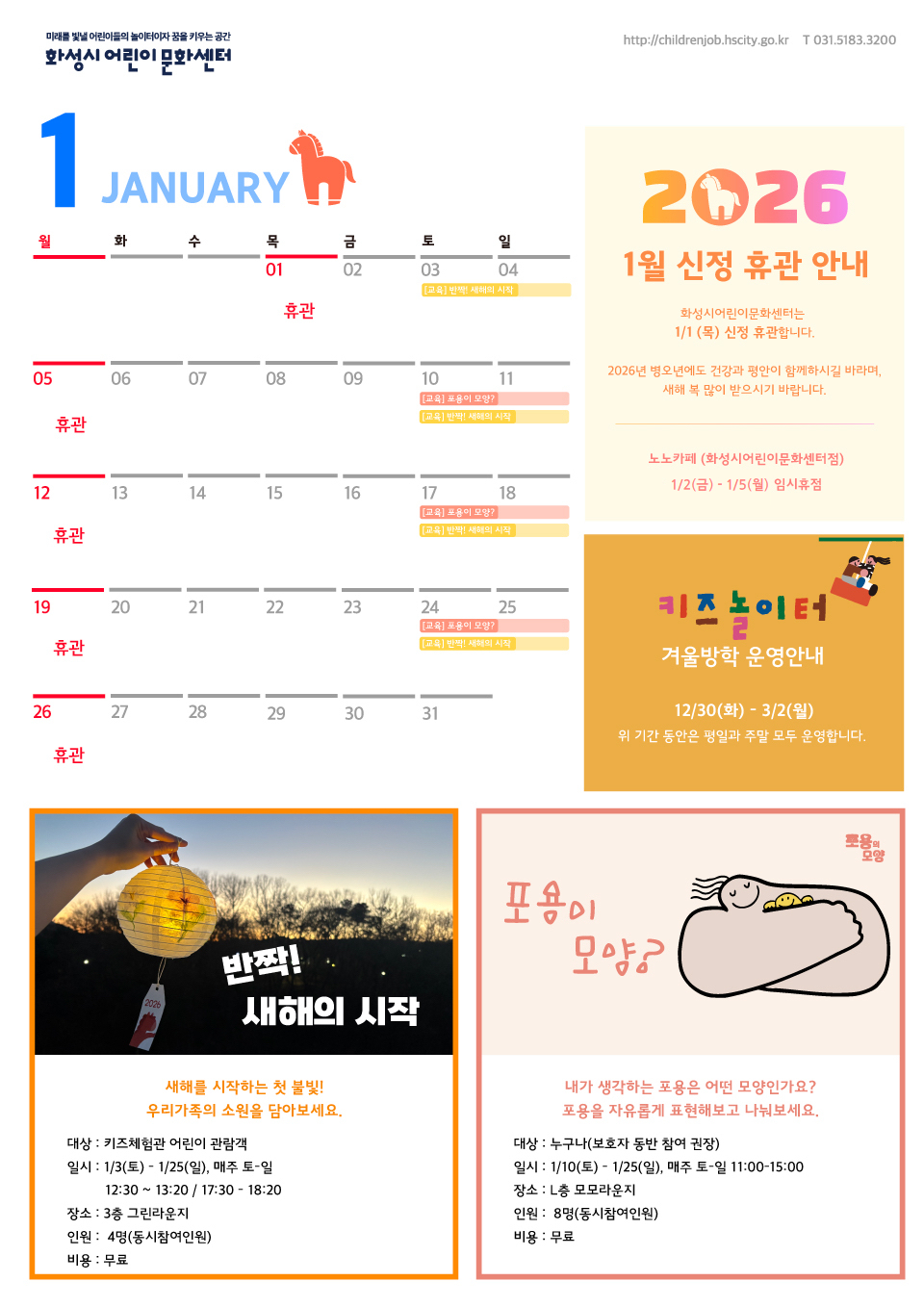 화성시어린이문화센터 내의 개별 서비스 이용, 이벤트 응모 및 경품 신청 과정에서 해당 서비스의 이용자에 한해 추가 개인정보 수집이 발생할 수 있습니다. 추가로 개인정보를 수집할 경우에는 해당 개인정보 수집 시점에서 이용자에게 ‘수집하는 개인정보 항목, 개인정보의 수집 및 이용목적, 개인정보의 보관기간’에 대해 안내 드리고 동의를 받습니다.